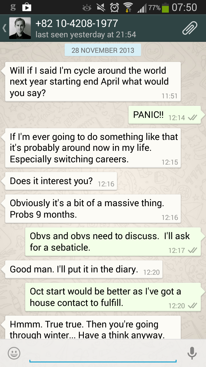 A quick look at google maps and I reckoned I could do a belt around the world in about 14,000 miles which couldn’t possibly take more than 9 months. Over the next 24 hours I came up with 1 reason. It would probably be quite a dangerous and lonely thing to do on my own. What about Will?