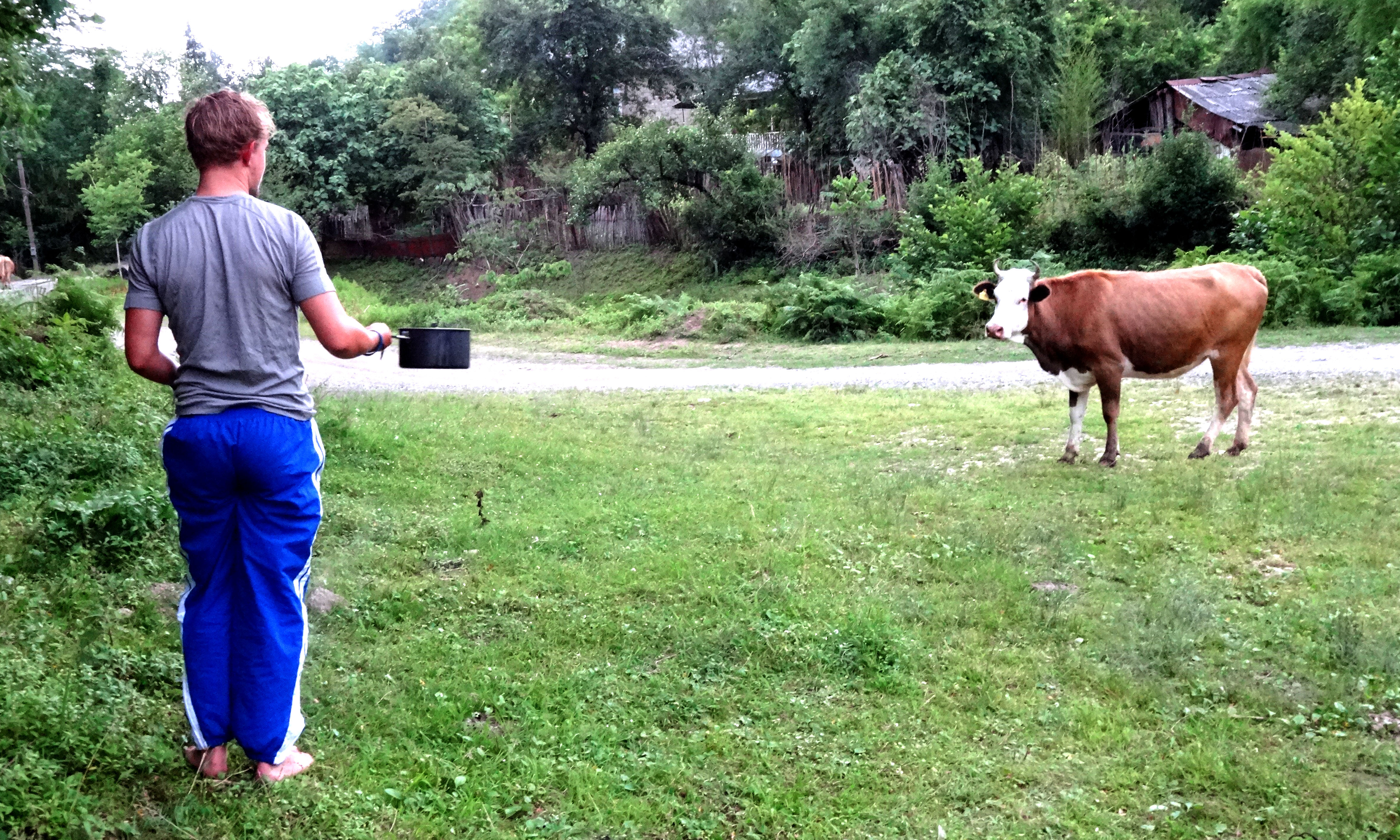 We found a quiet place to camp outside Lanchkhuti, Georgia only to be surrounded by wandering cows. This one was particularly interested in my cooking.