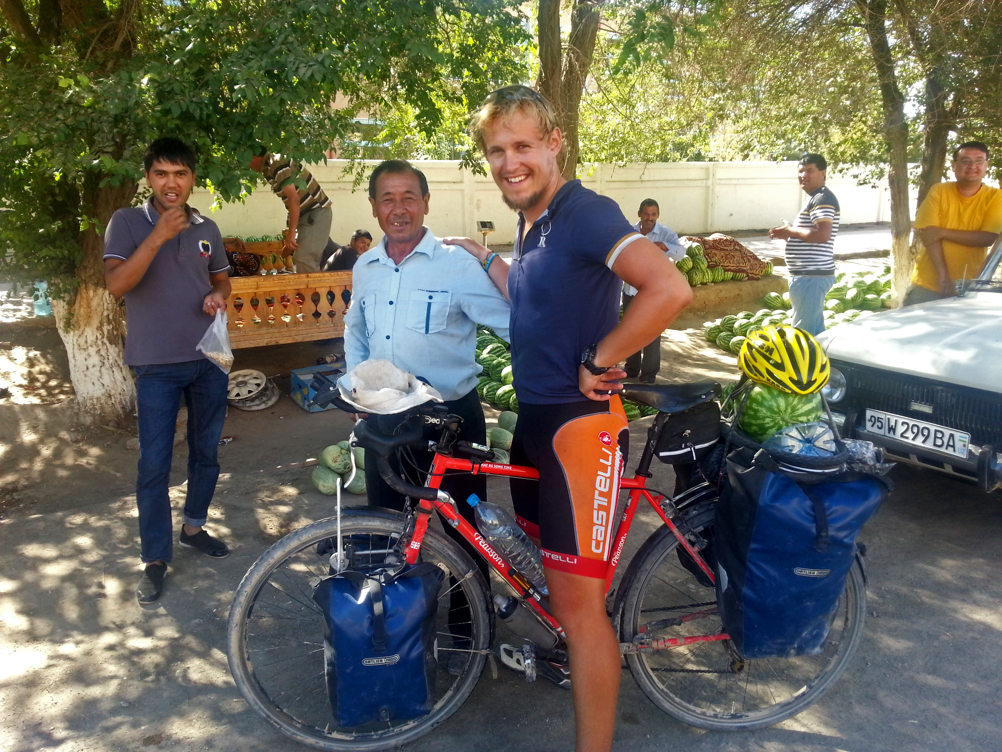 On our way out of Beruni we were stopped by a family eating watermelons. We insisted we had to get going and couldn’t join them so they gave us a whole watermelon which got strapped on the back. Another 7kgs to add to the already overloaded frame. Outside Beruni, Uzbekistan.