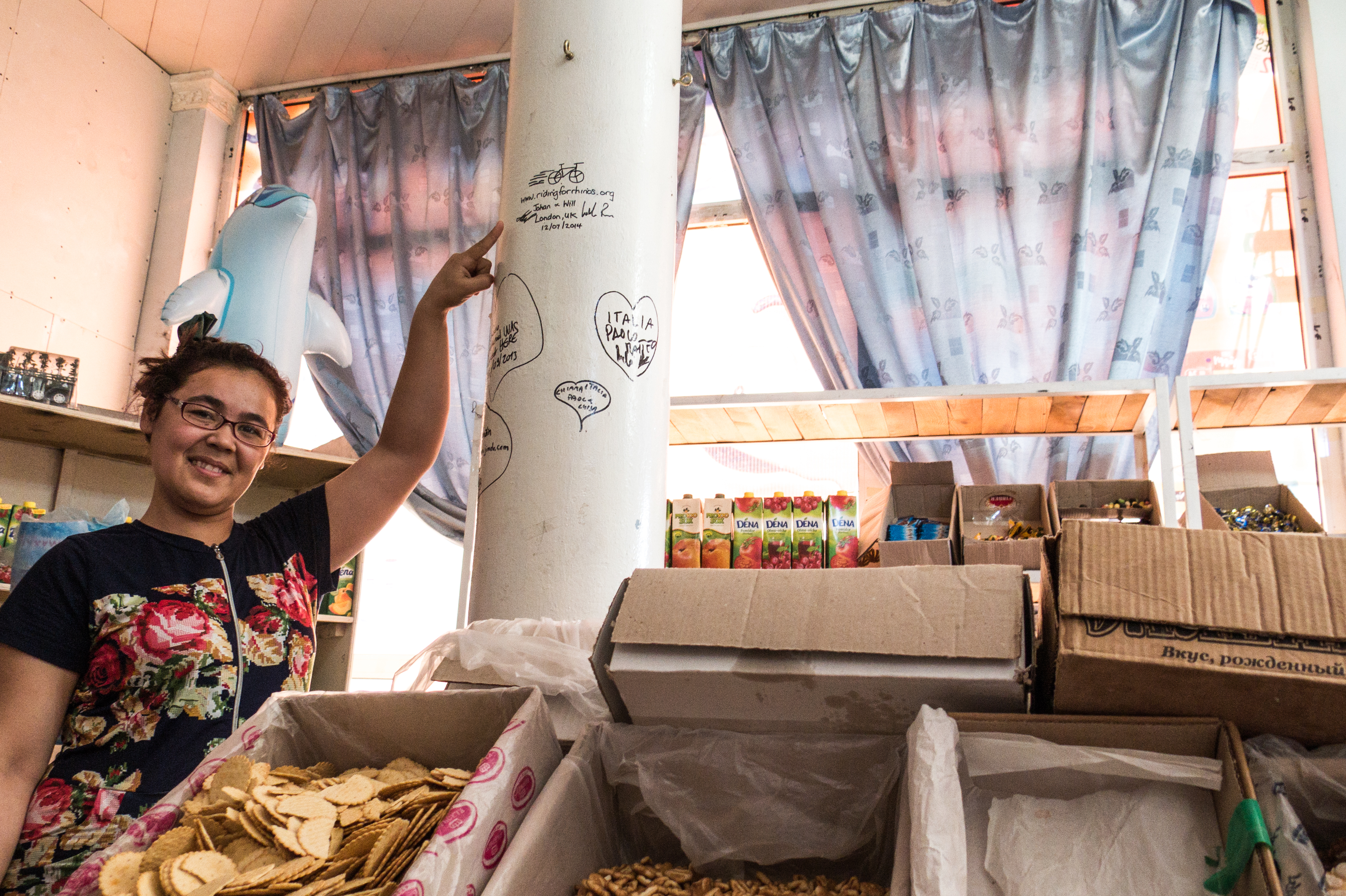 Friendly shop owner who asked us to write a message on this pillar. Her and her sisters were VERY excited to see us.