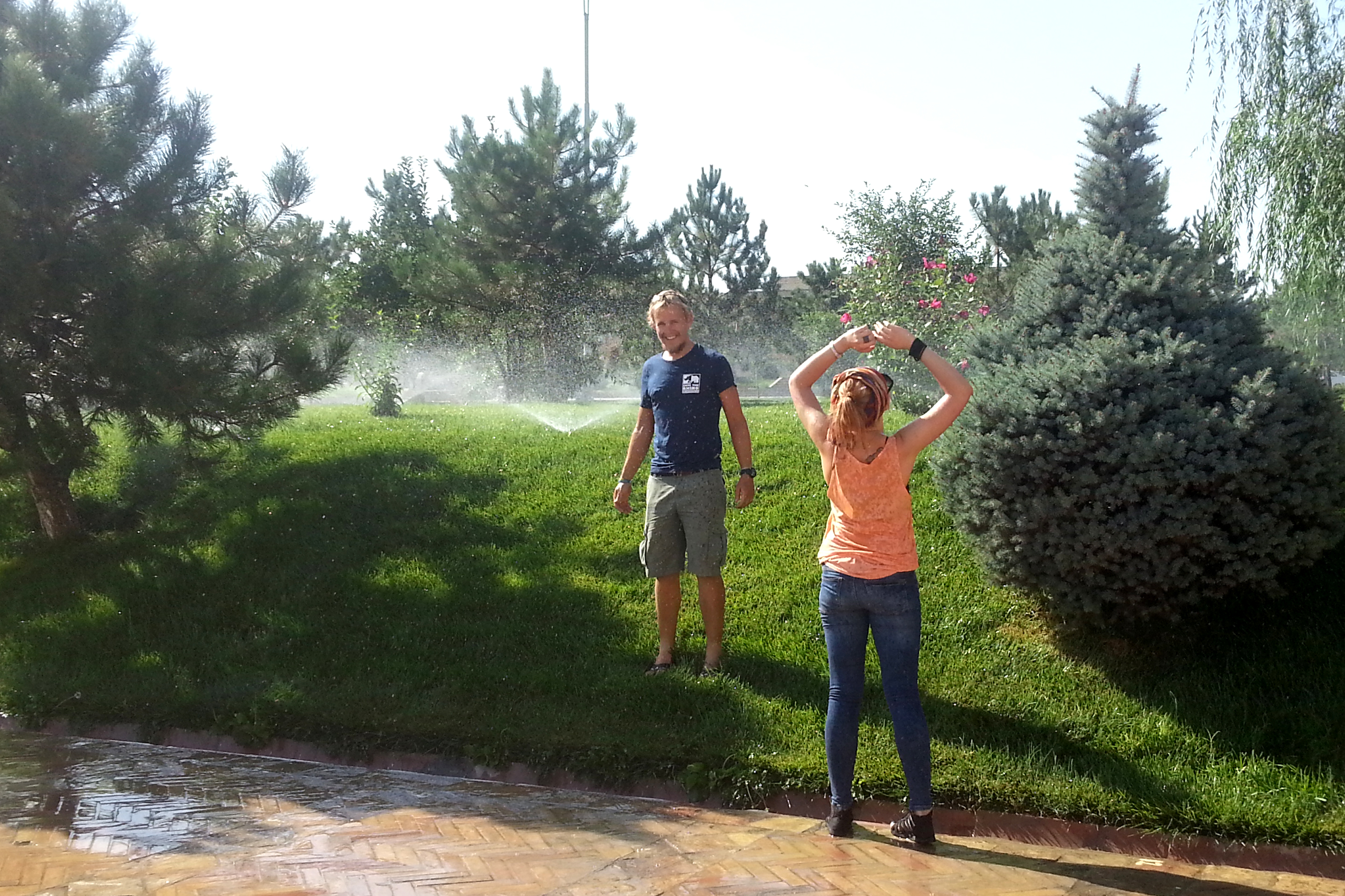 Sprinklers in the middle of the day. Great way to cool down. Ana showing us the way. Tashkent, Uzbekistan.