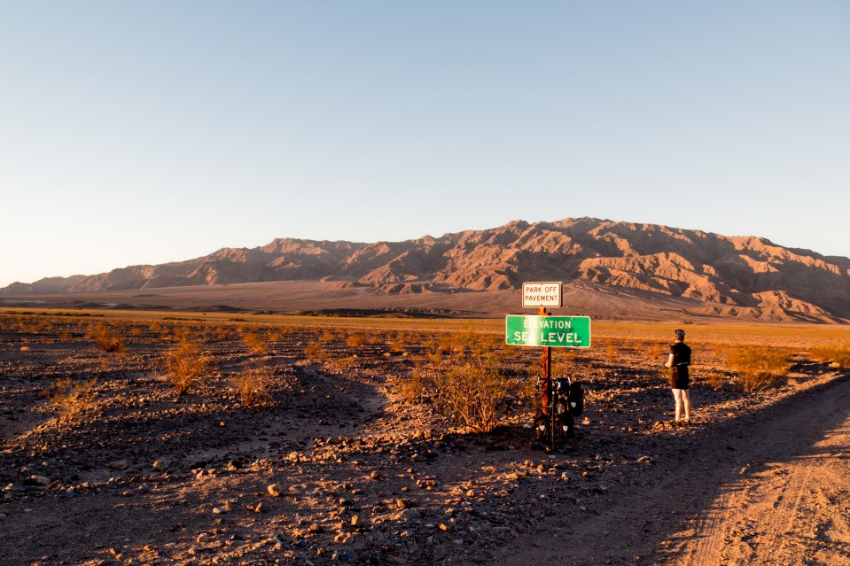 At last the sun storms over the ridge and fills the valley with heat. Garmin is showing the temperature rising 1 degree every few minutes. Climbing from the lowest point on the trip (-70m elevation) back to sea level in Death Valley, CA, USA.