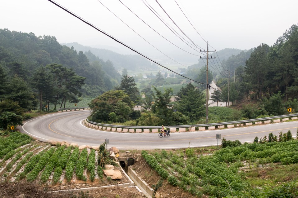Windy descents through the mist. Heading for Mungyeong, South Korea.