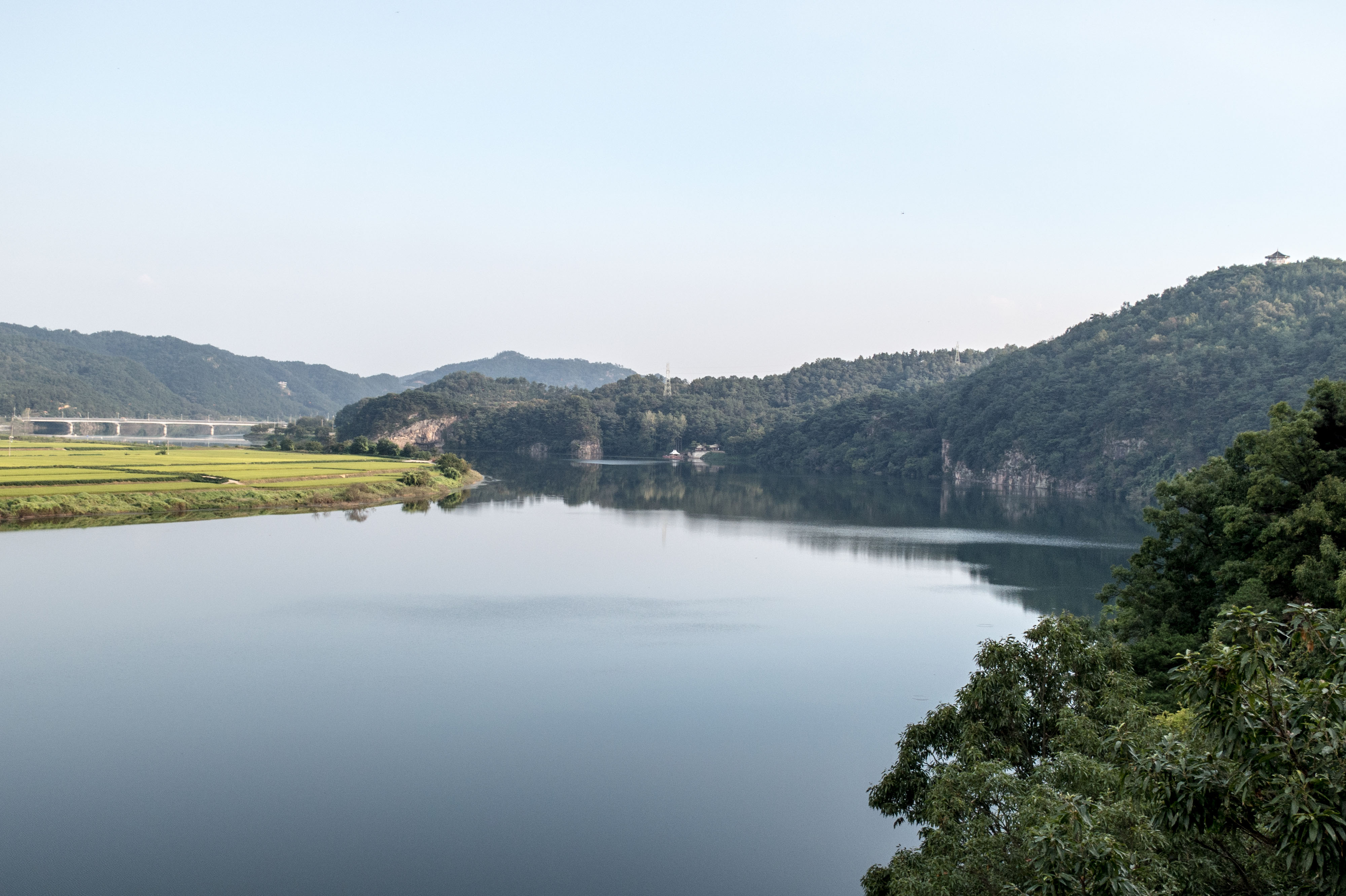 The river near Sangju. We climbed the 20 degree hill up to the pagoda on the right. It was barely walkable. Near Sangju, South Korea.