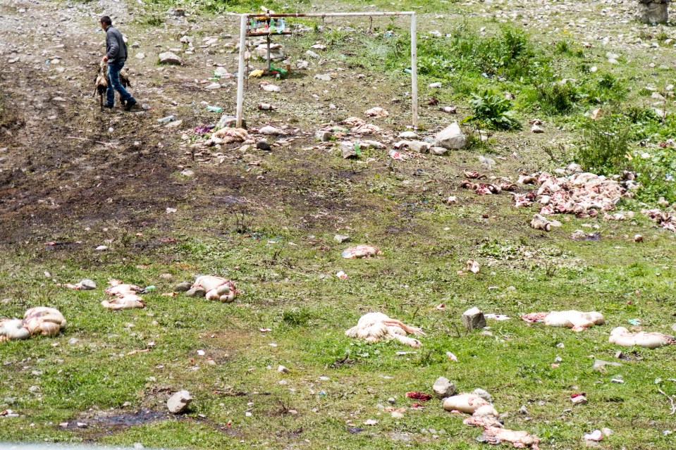 The remnants of the festival the previous day. It turns out the hundreds of people had gathered to each sacrifice their best sheep. The heads and guts left lying all around. Smelly!