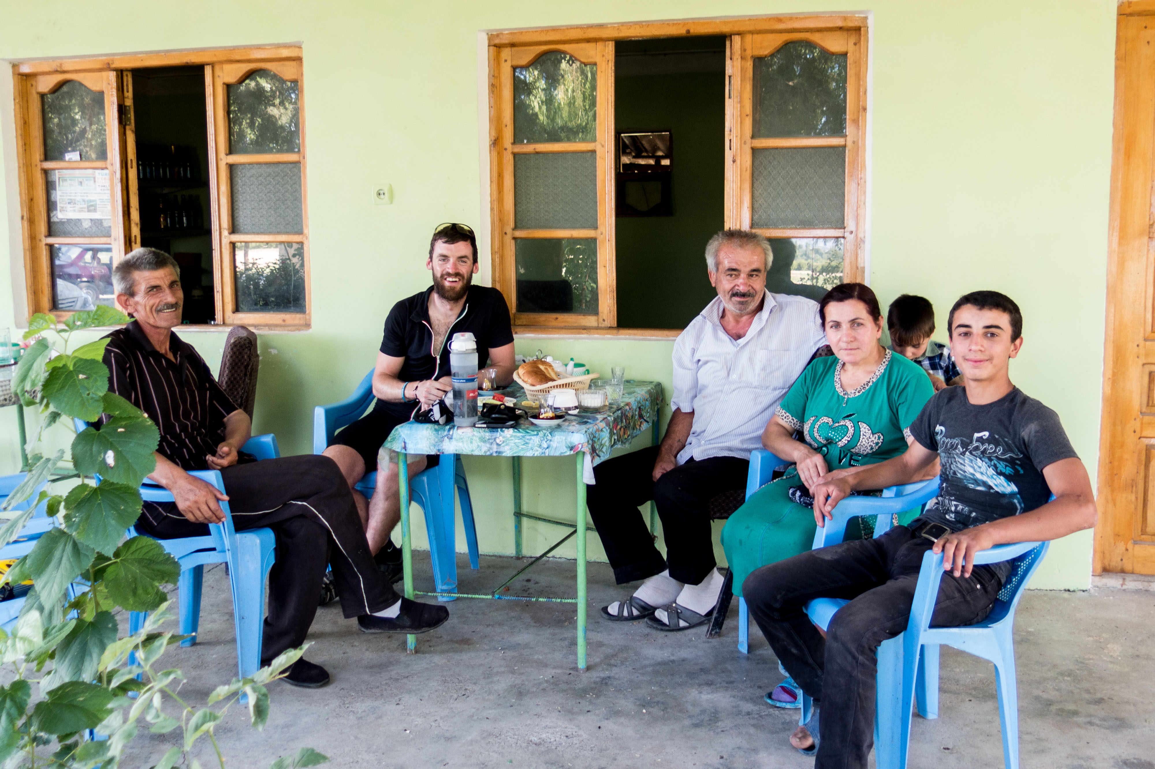 Another man and his family who invited us in for tea, bread, tomatoes, cucumber and cheese. Such great people. We think he said he was the boss of the whole valley… Near Sheki, Azerbaijan.