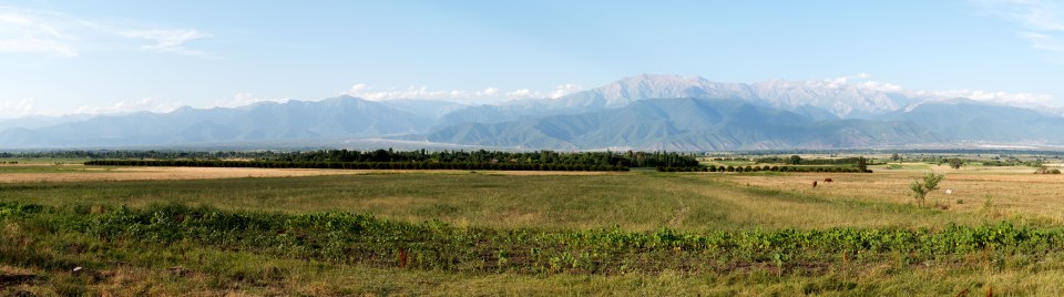 Cycling along a massively wide valley with the Caucuses alongside to the north.