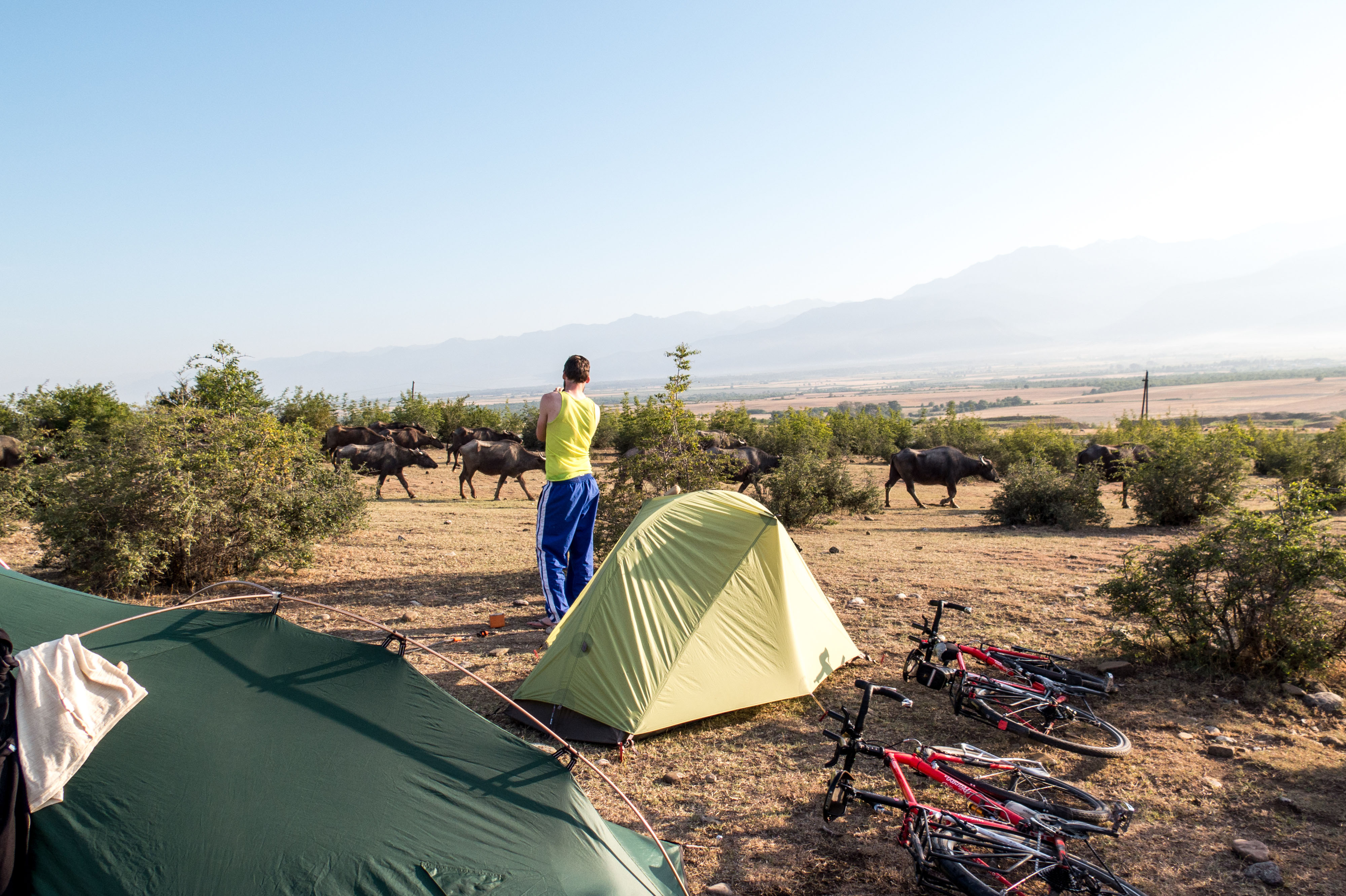 Water buffalo (we think) trekking through camp in the early morning sun.