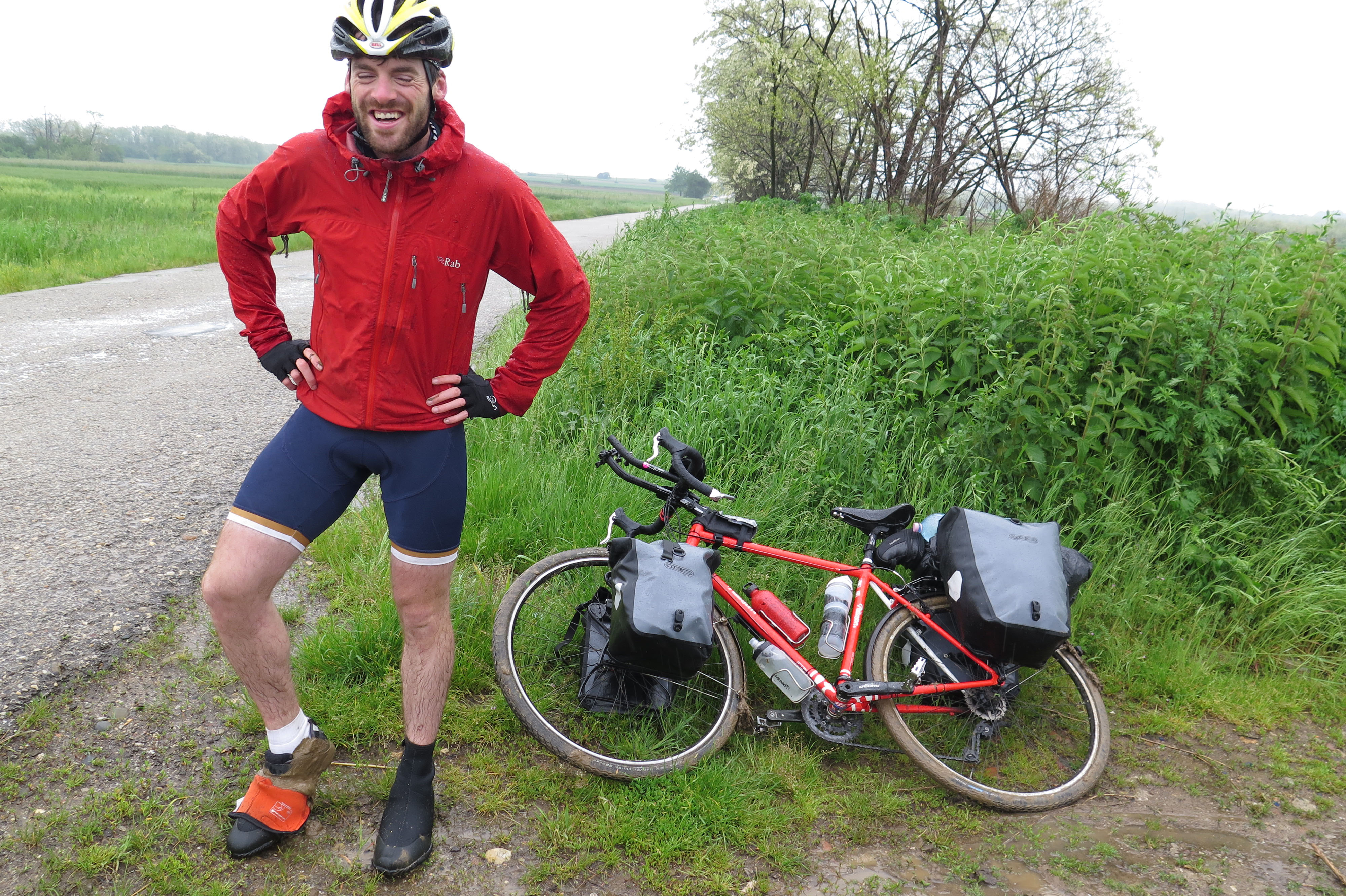 Will’s feet started looking particularly swollen as we lugged our bikes bake onto tarmac from our overnight tenting spot. It turns out the overshoes aren’t mud proof. Half hysterics, half crying.
