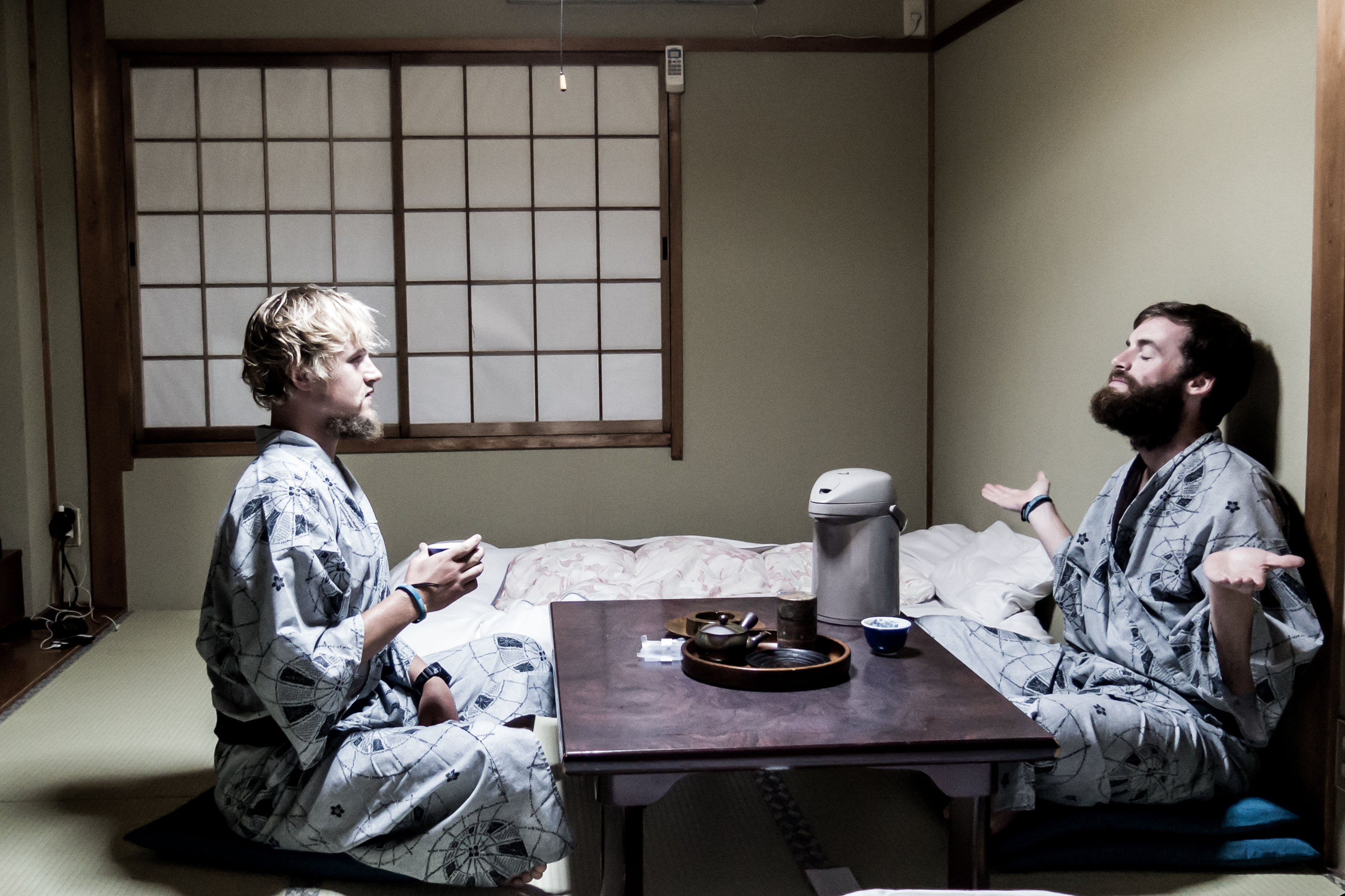 Climbing into the Japan Alps, the heavens opened so we retired to a little Japanese Inn in the mountains. Wearing our Kimono (Yukata) and drinking tea. Gujo, Japan