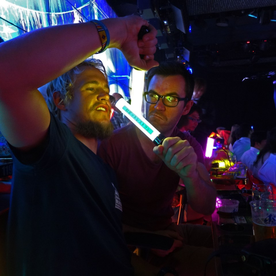 Fighting Dr McVicar with a “lightsaber”. Trying to fit into the weirdness around us. Robot Restaurant, Shinjuku, Tokyo, Japan