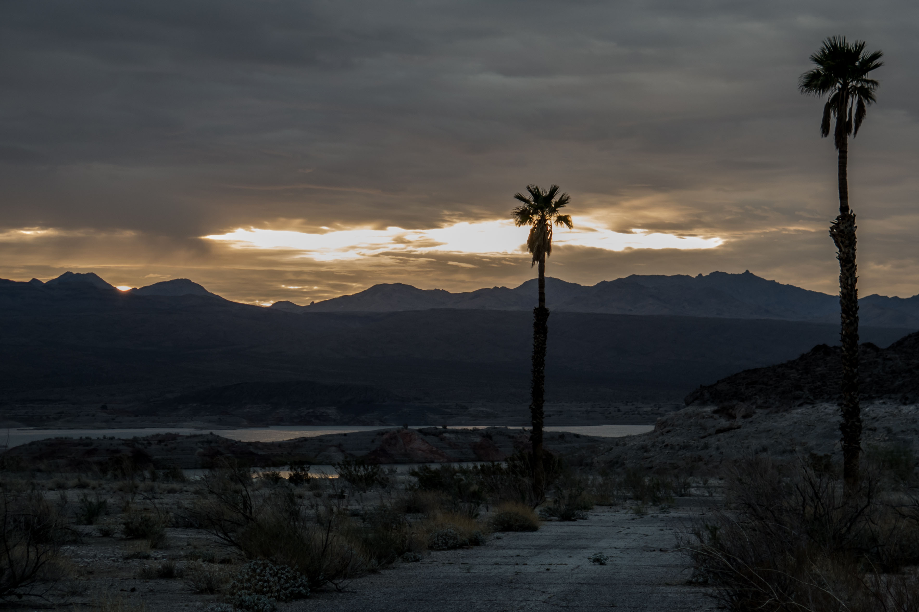 Sunrise over Lake Mead. Early start to try and find some proper food before the hunger becomes too much to handle. Echo Bay, Lake Mead, NV, USA