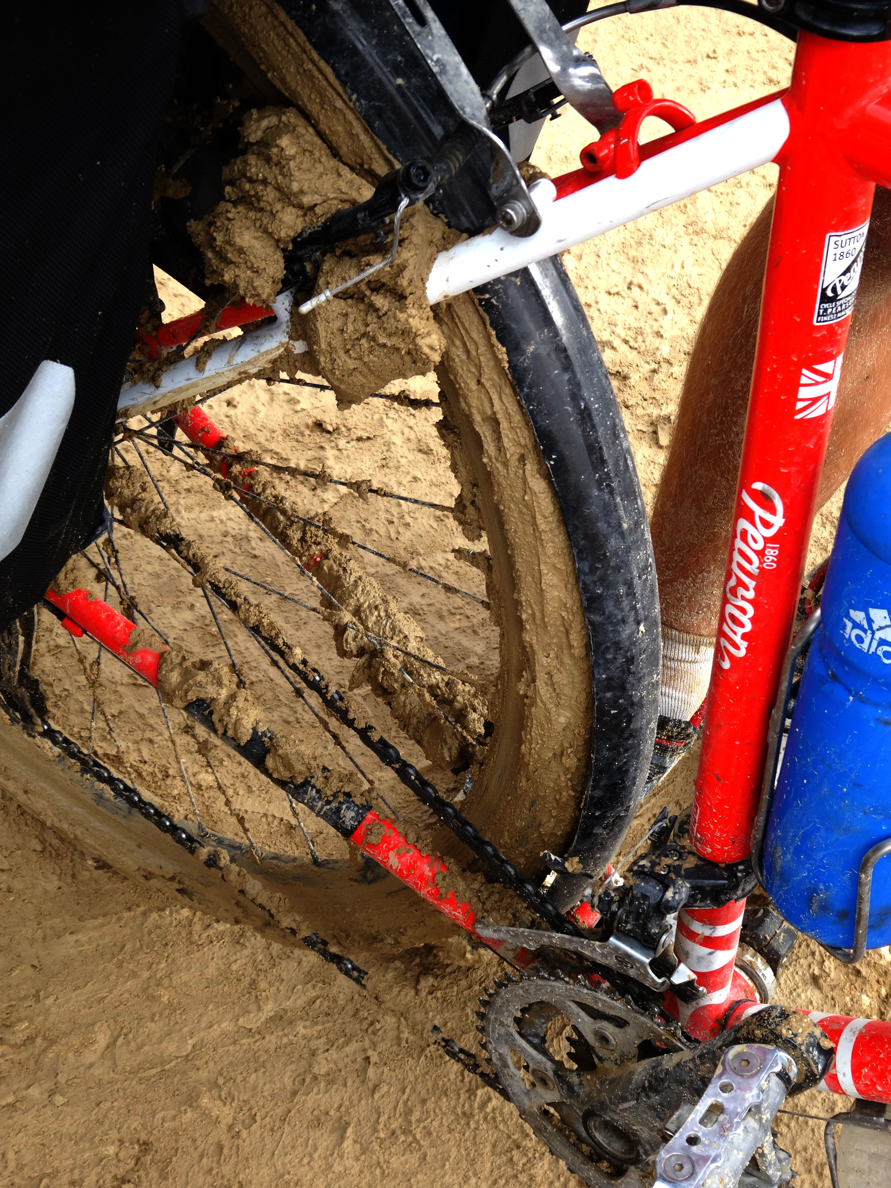 The rain suddenly came crashing down. We tried to cycle but got completely clogged up. Then we tried to walk but the wheels completely seized. So we stood in the rain…