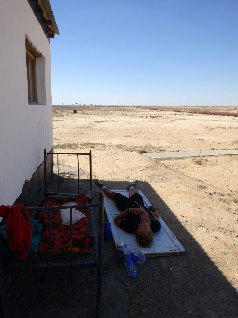Escaping the midday sun behind a security guard’s hut. Who knew sleeping on a door could be so comfortable. Near Jasliq, Uzbekistan