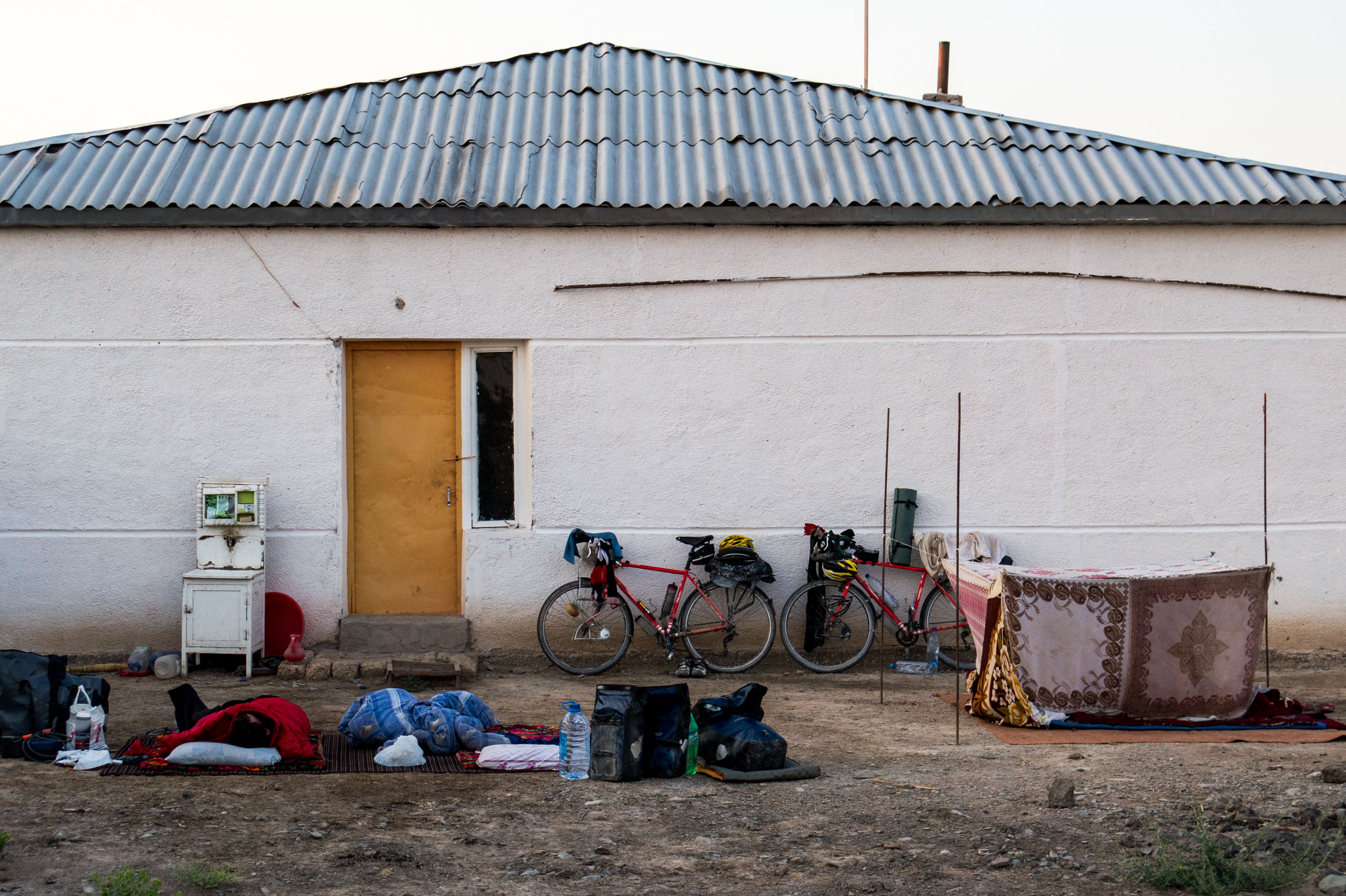 We couldn’t quite make it to Nukus so we spoke to one of the locals who ended up sending us to this family to stay with them. We woke up outside sleeping alongside the family in their mosquito net.