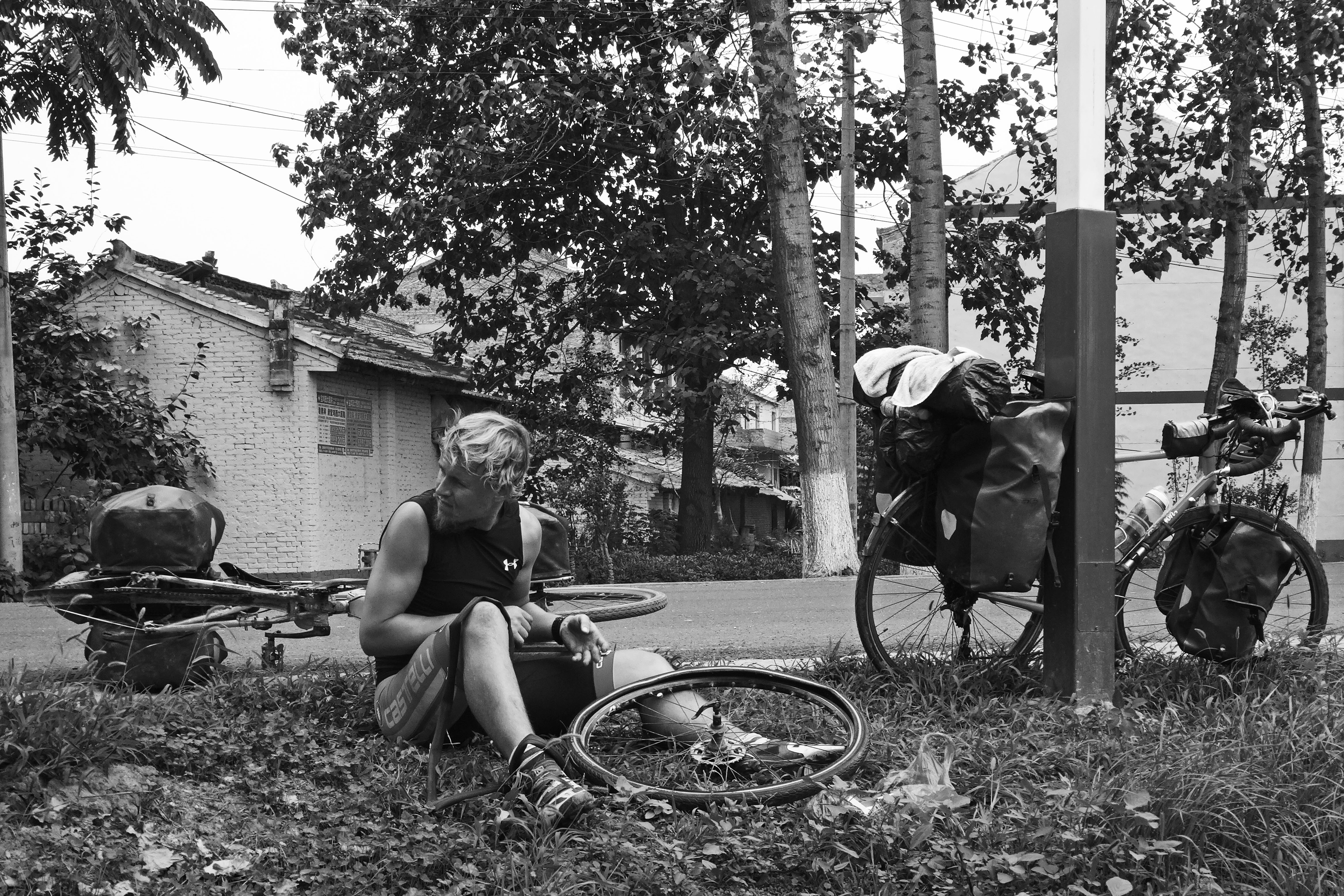 A torrid day with the punctures. My supposedly “bomb-proof” tyre had a mystery puncture devil stuck in it. Heading for Xian, China.