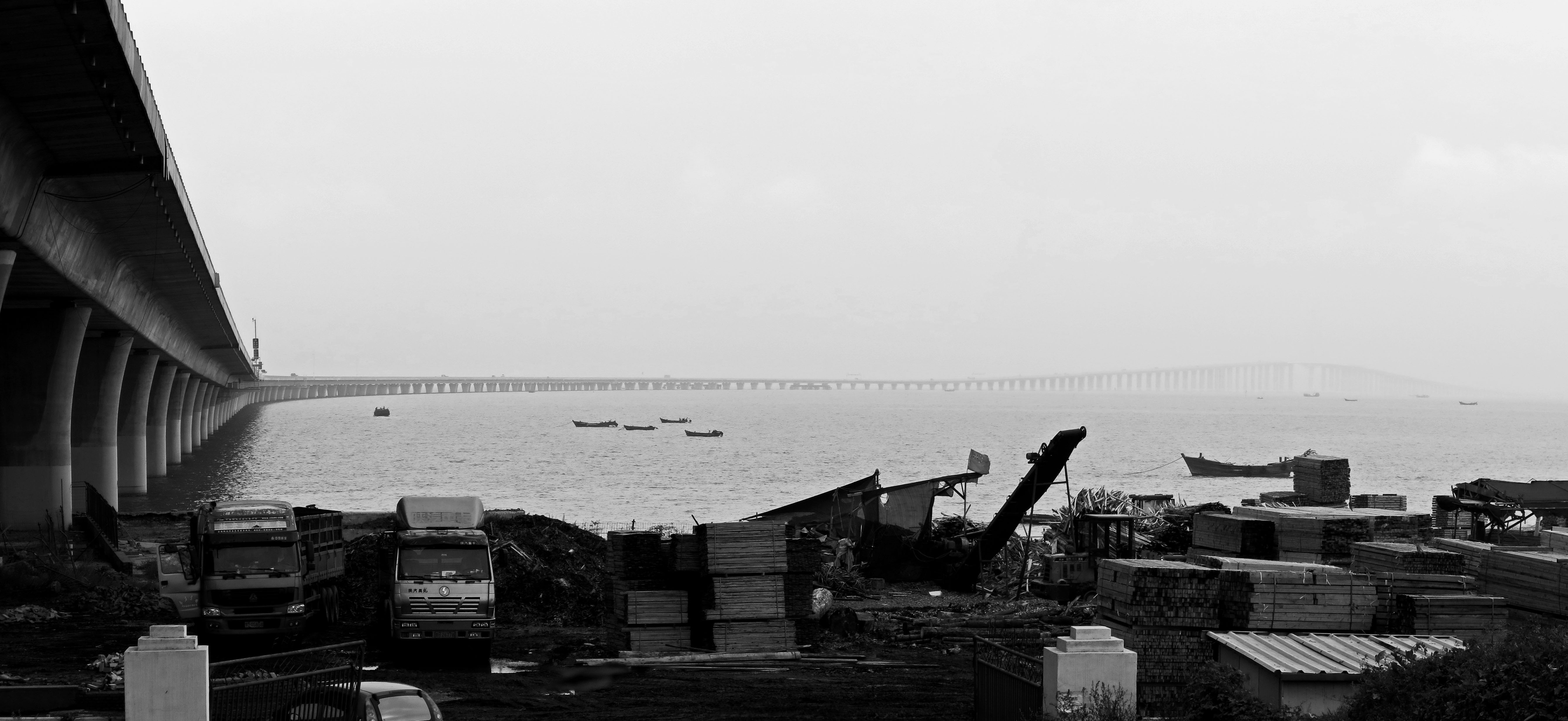 Our first glimpse of the Yellow Sea and this, the longest sea bridge in the world. At over 40km it is a stunning piece of engineering. Qindao Bay, Shandong, China.
