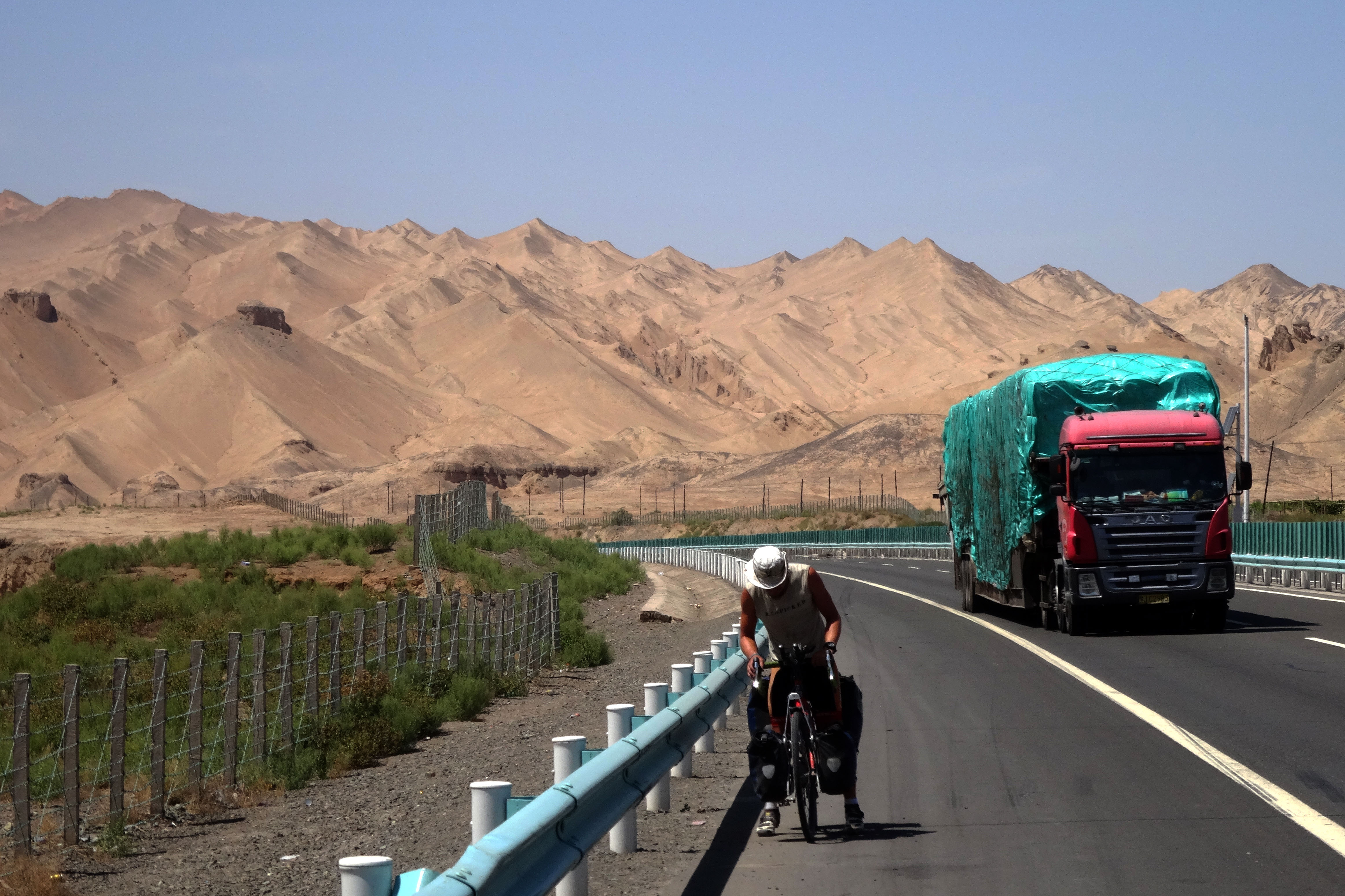 Climbing out of the Turpan depression. The wind died and it became deadly hot. Turpan, Xinjiang, China.