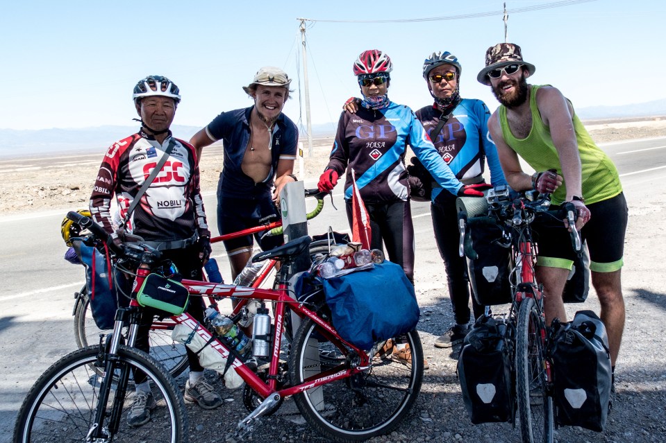 Some excited Chinese cycle tourers on mountain bikes. How they survive in long clothing in 40C we’ll never know. Crossing the desert gap heading for Kumul, Xinjiang, China.