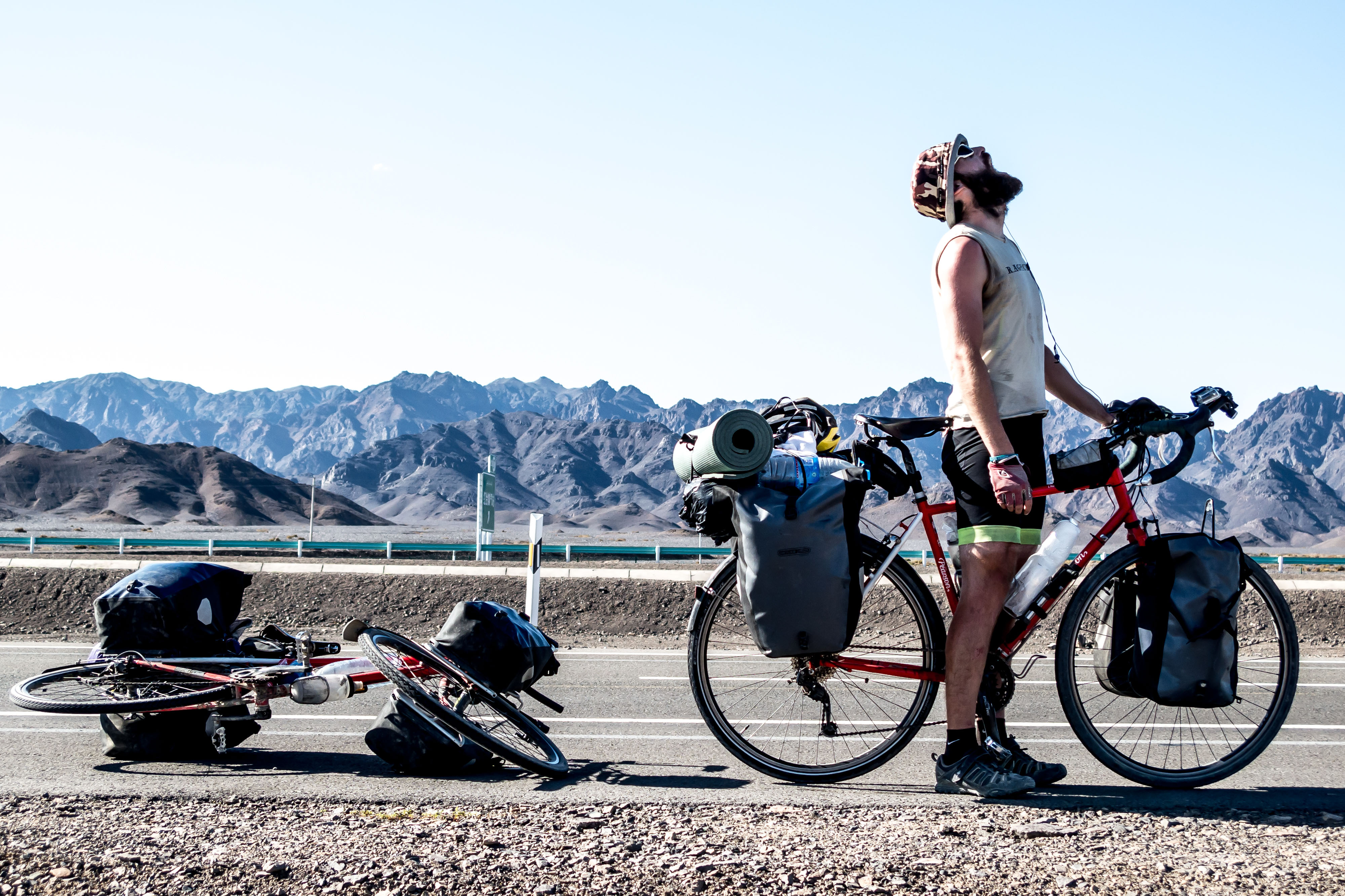 The petrol station promised by the signs turned out to be closed. Over 100km without water in the desert heat. Not ideal. Heading for Kumul, Xinjiang, China.