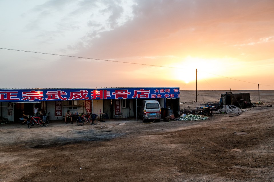 The dust out in the desert produces some incredible colours at sunset. We found this little restaurant in the middle of nowhere to give us some noodles. East of Kumul, Xinjiang, China