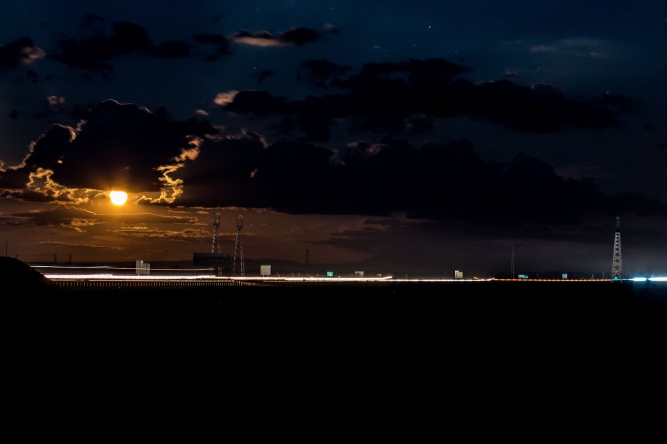 The moon emerging for the night. So bright it was like a second sun. Heading for Zhange, Gansu, China