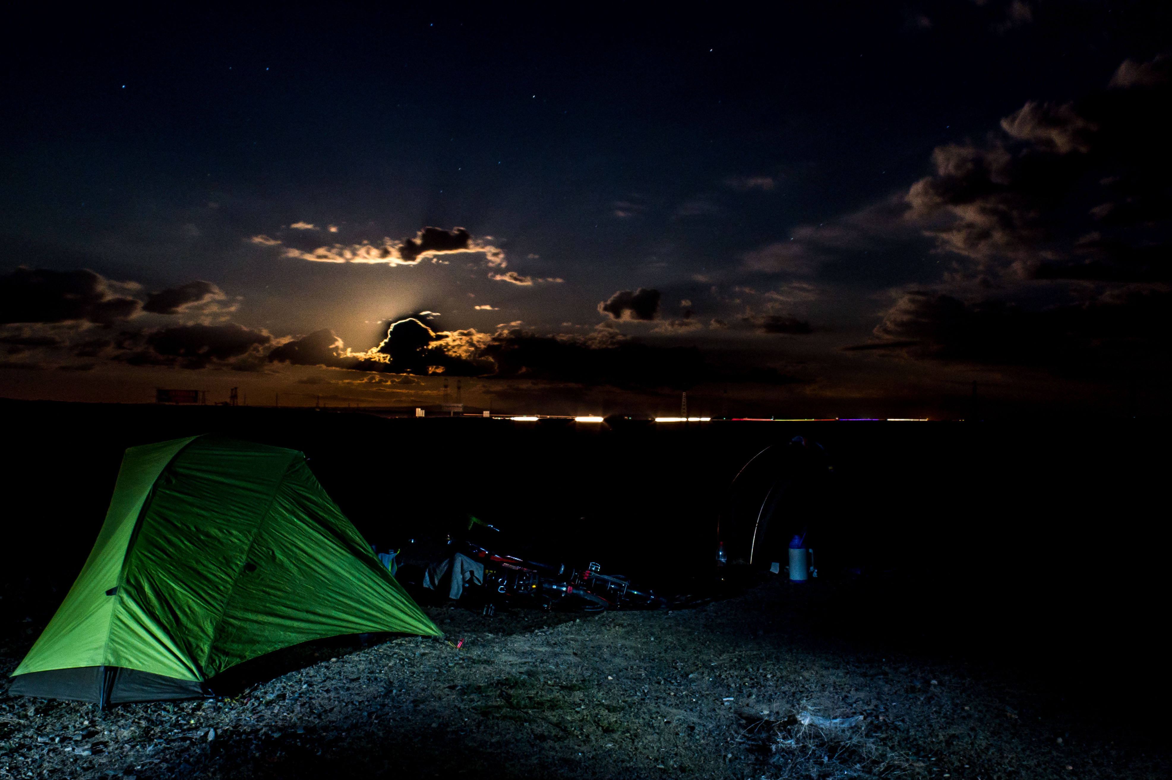 Camping 100m off the highway. Light from road, moon and torch.