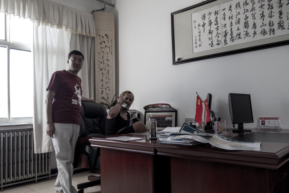 Having breakfast with the Party Secretary of the Gansu Expressway and then drinking tea in his office. On the phone to his nephew in Canada to help with some translation.