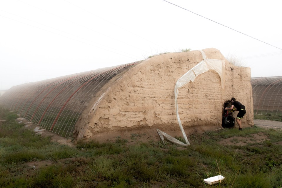 Emerging from our overnight stay in a greenhouse. A very misty morning. South of Dingxi, Gansu, China.