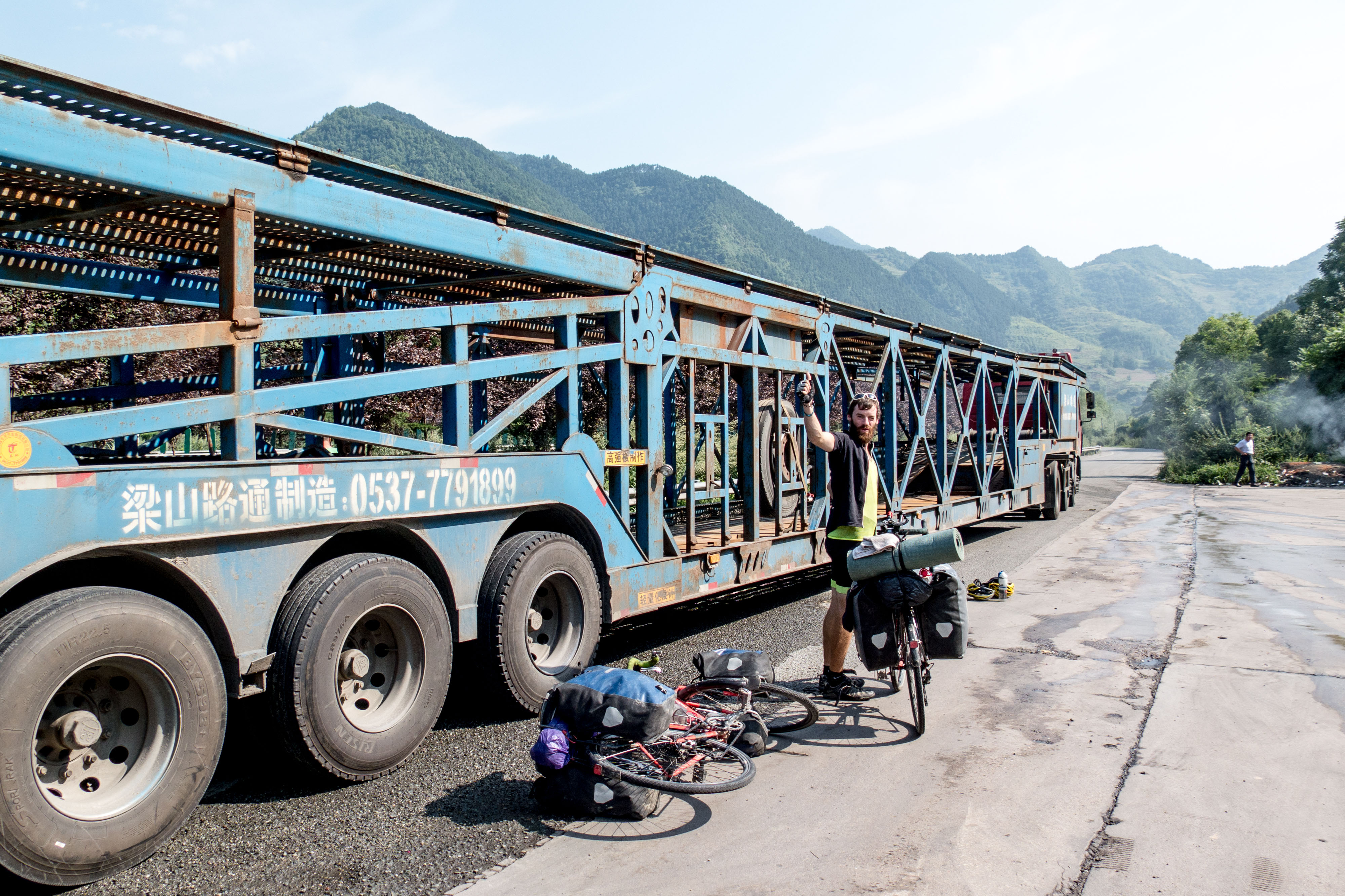 The police stopped us and wouldn’t let us cycle though one of the tunnels. They put us on one of the empty lorries coming past. An unavoidable 22km of no cycling. Crossing into Shaanxi Province, China.